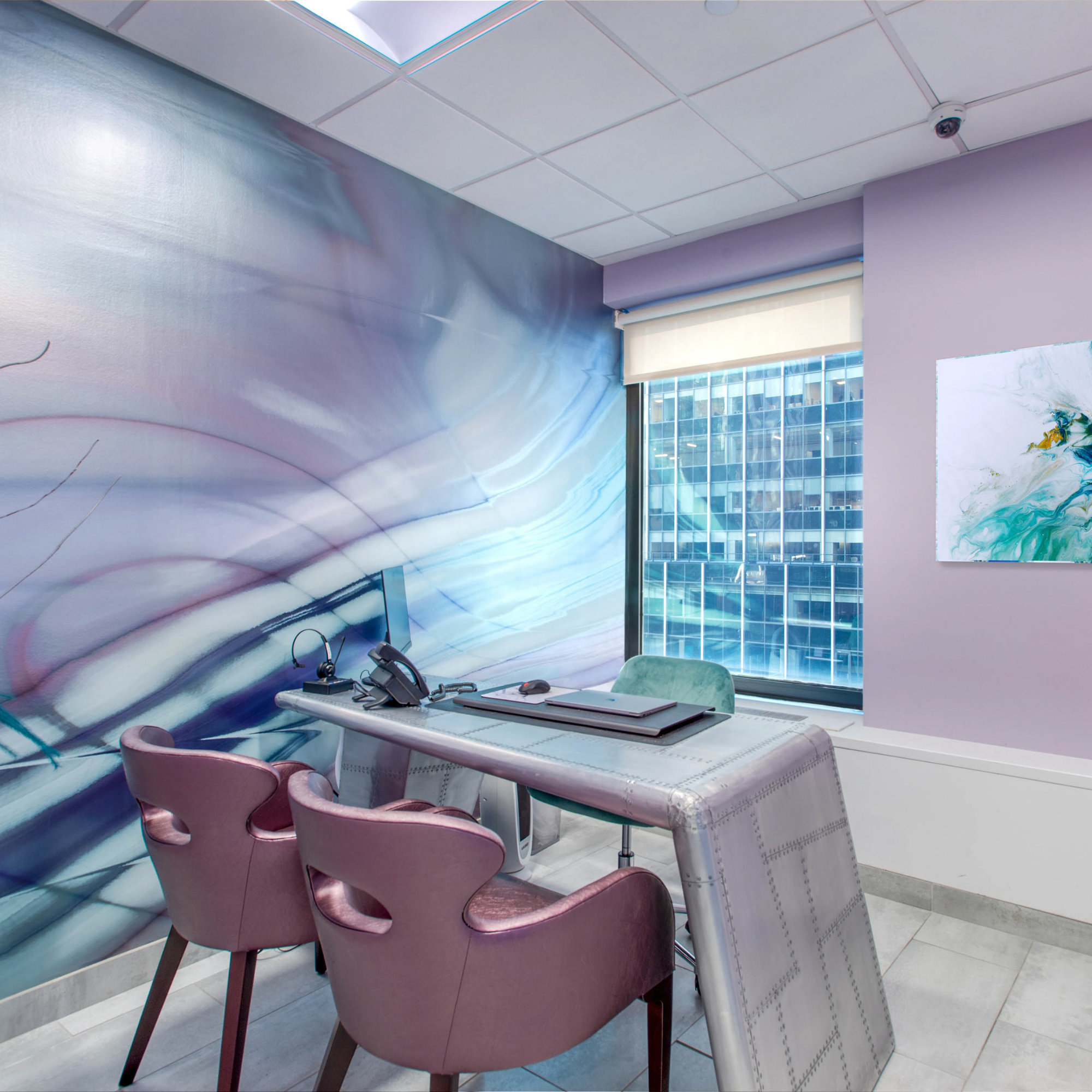 We designed the 2,100 sq ft NYC offices for Prasad Cosmetic Surgery, combining clinical spaces with a state-of-the-art operating suite. Light colors, aluminum, and frosted glass elements create a bright, airy feel while maintaining privacy.